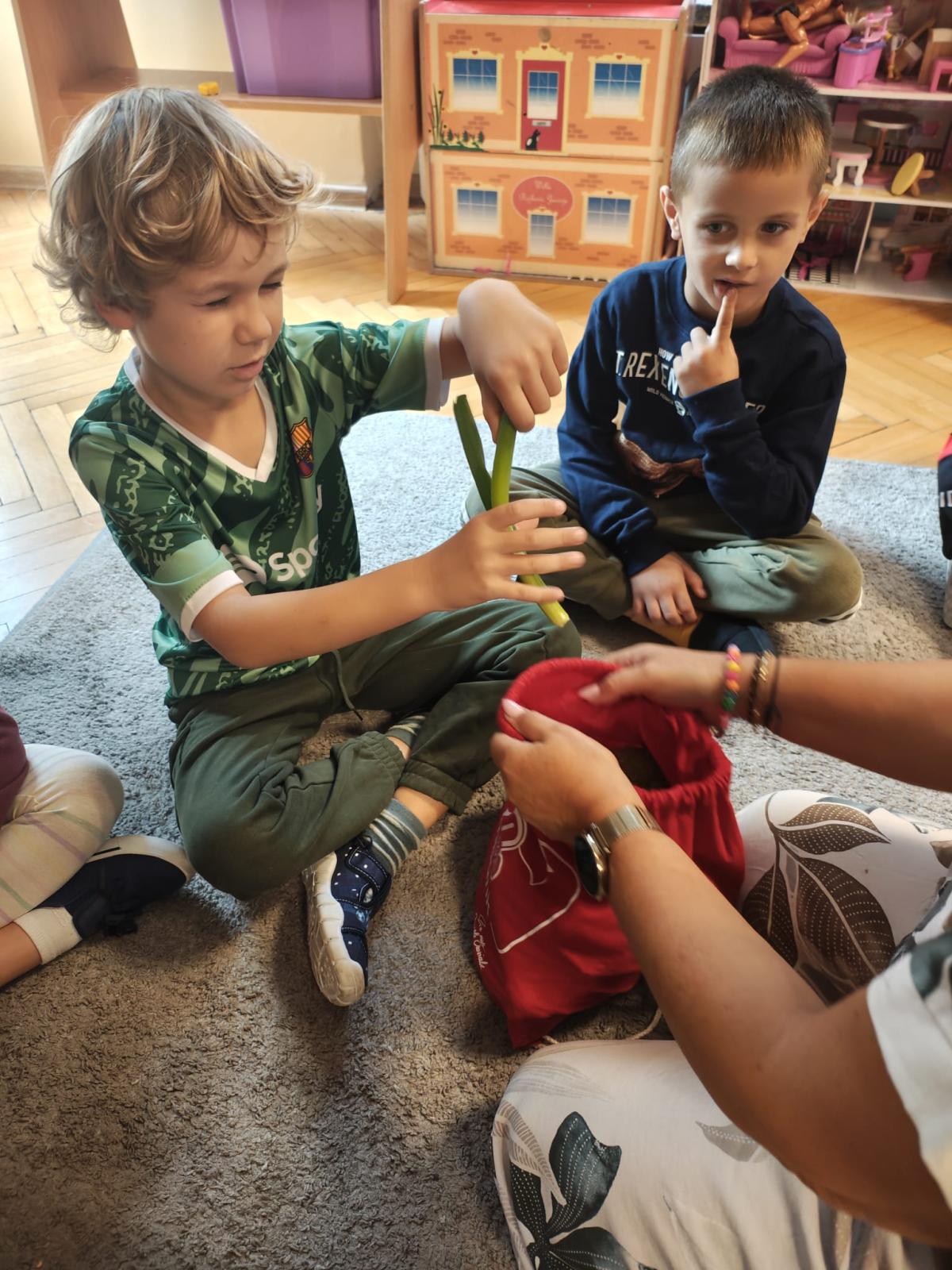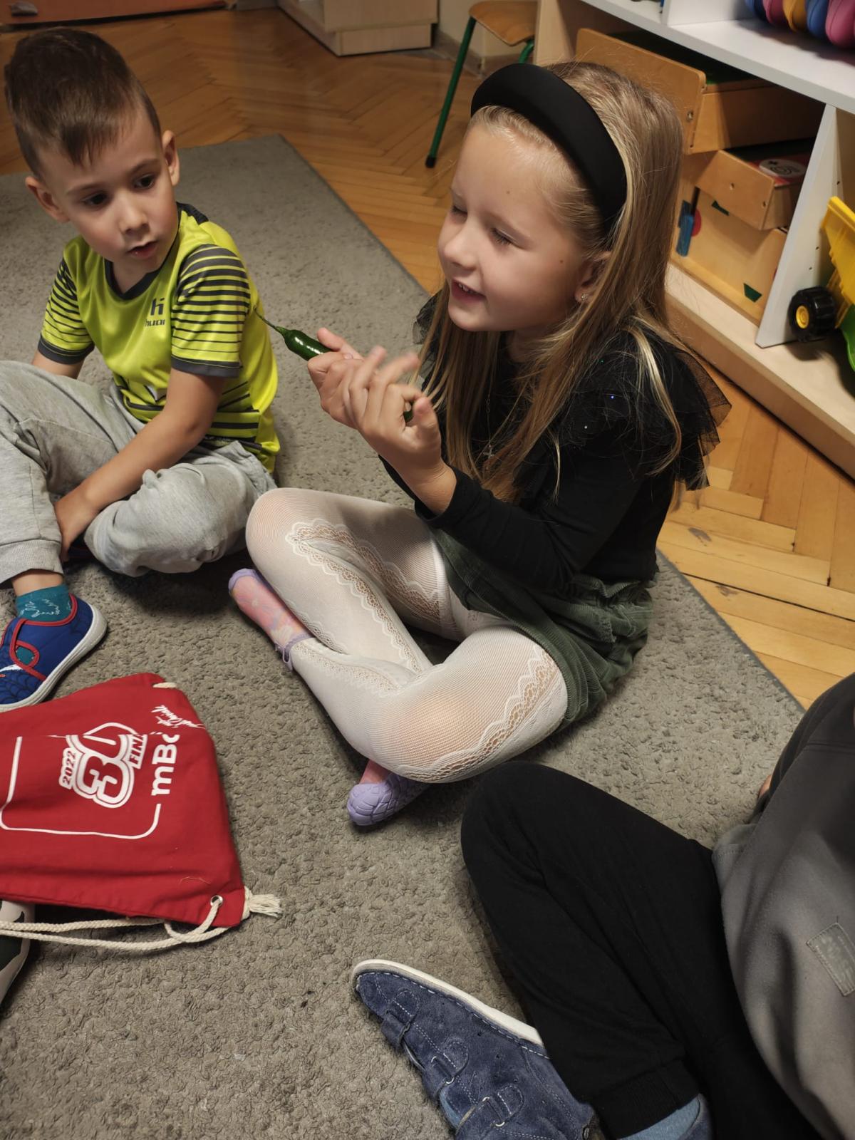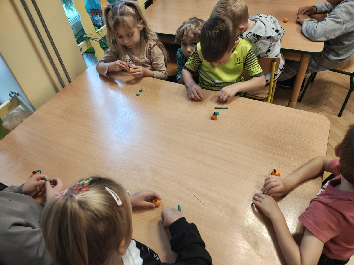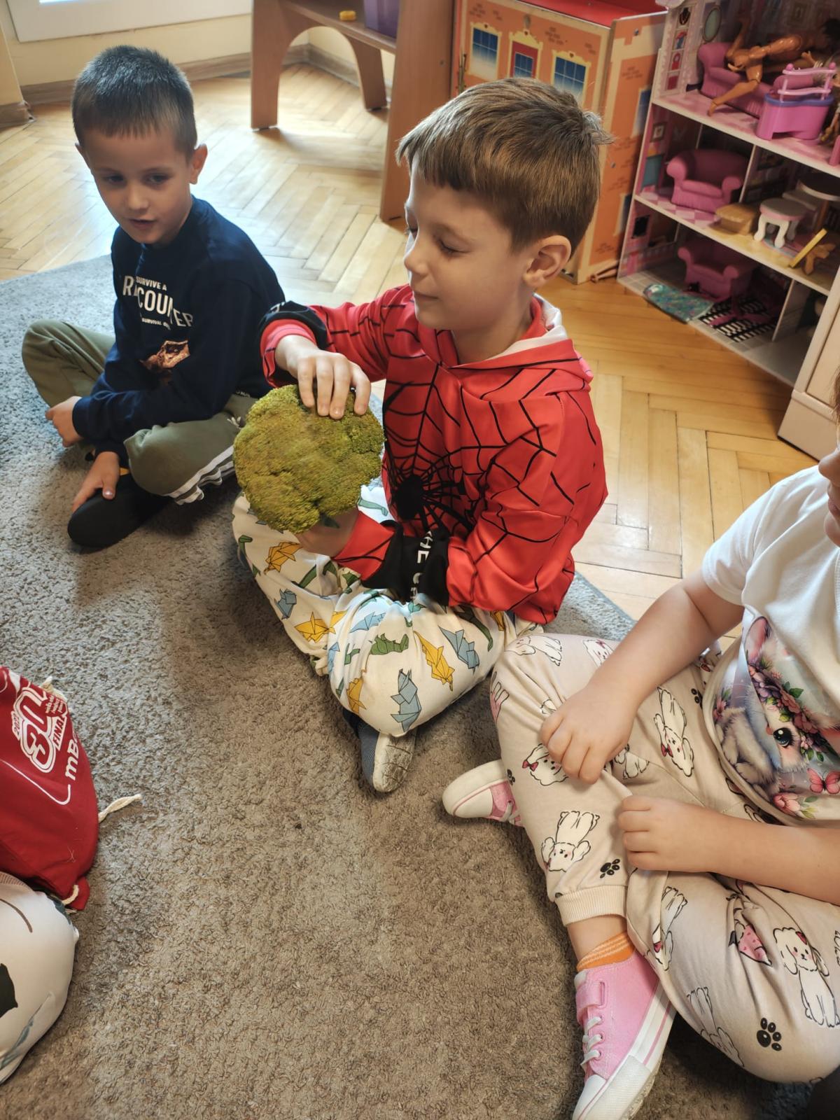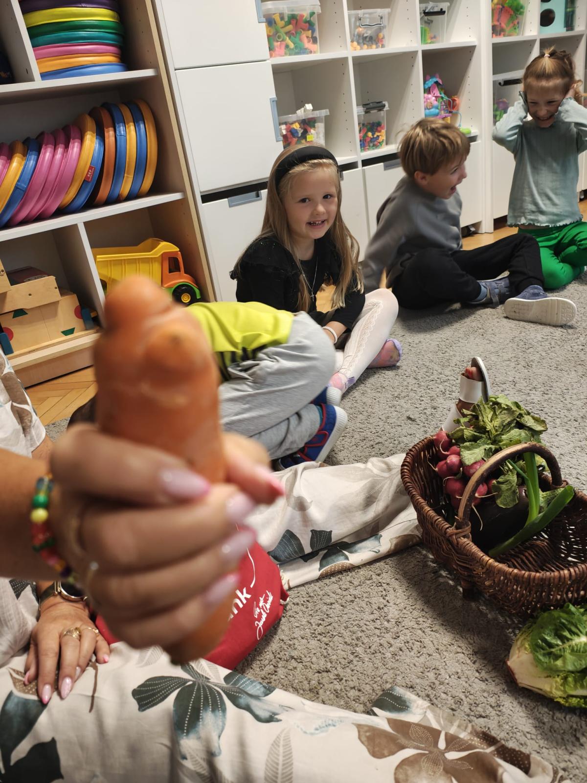 Dziaj na zajeciach utrwaliliśmy sobie nasze wiadomości o warzywach. Dzieci z zadowoleniem wyjmowały z worka warzywa i poznawały zmysłem dotyku nie patrząc jarzyny. Potem lepiliśmy dyńkę z plsteliny. Zobaczcie sami jak fajnie się bawiliśmy.....