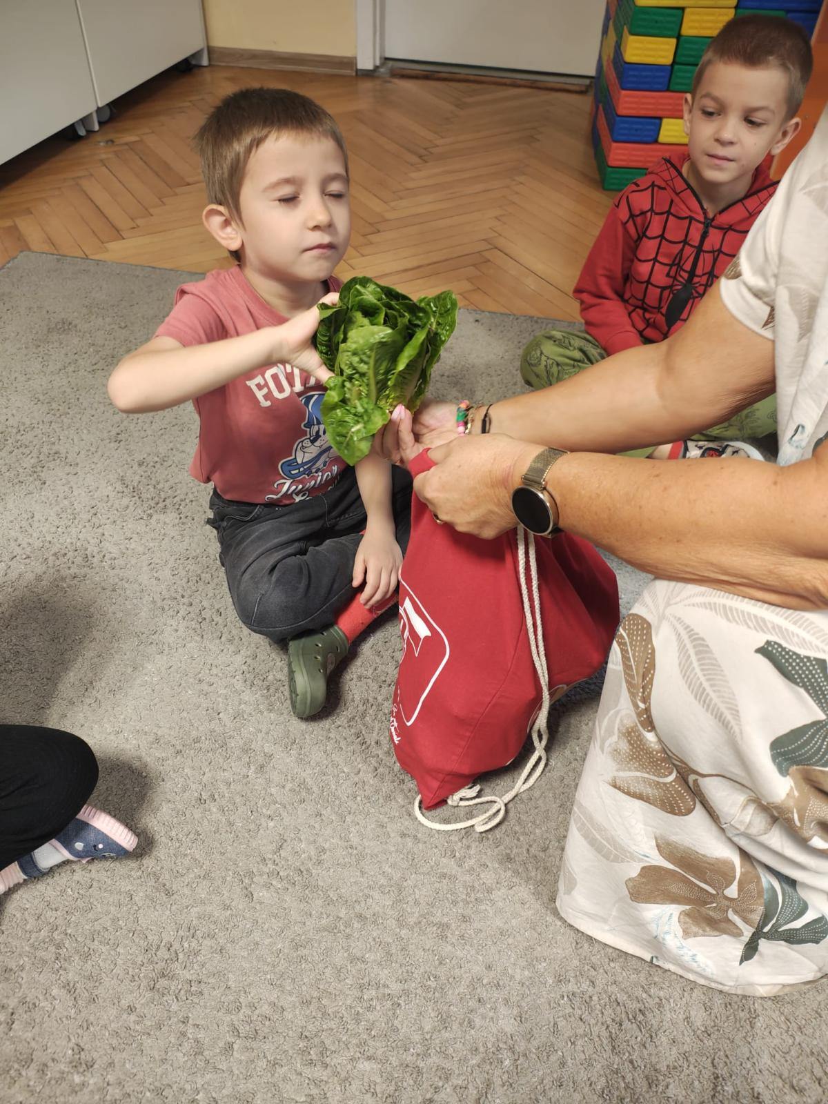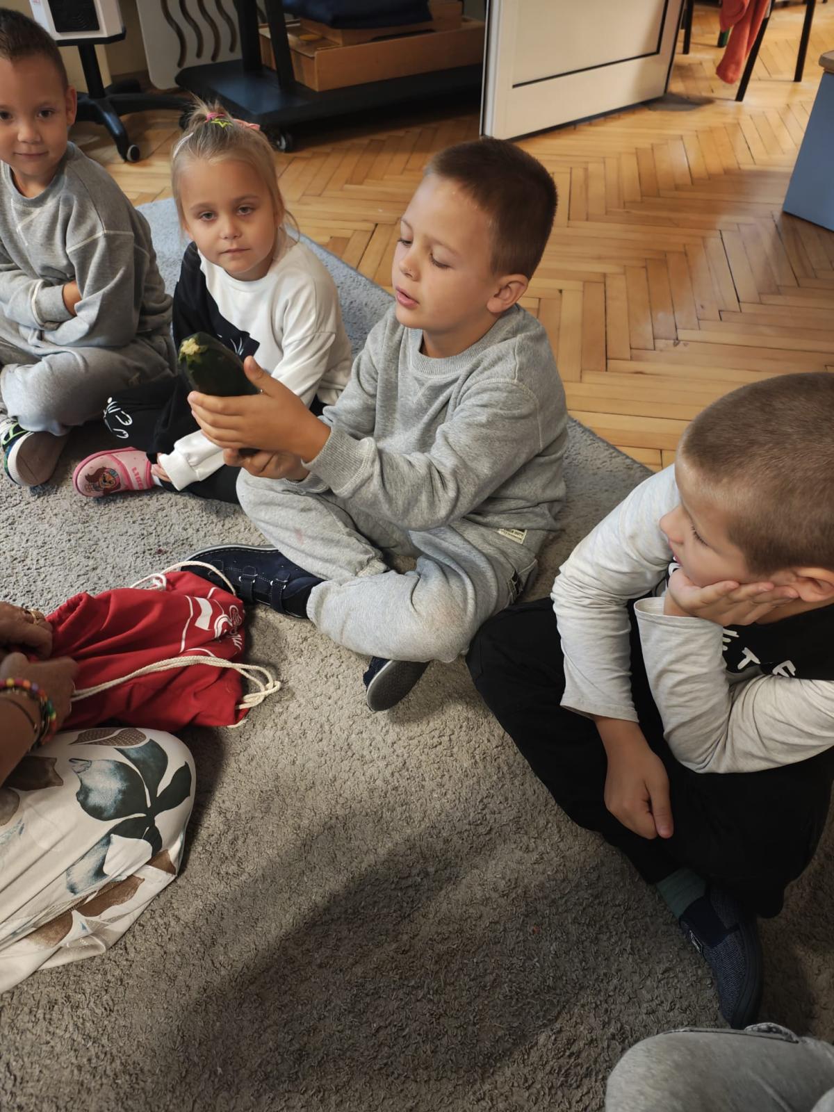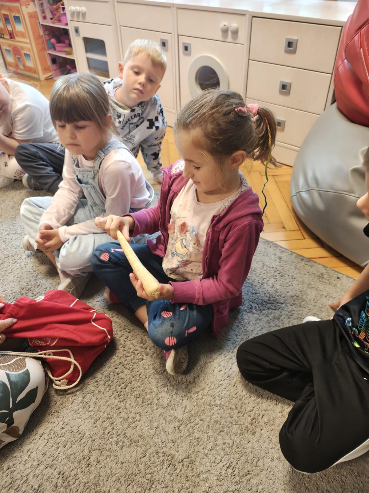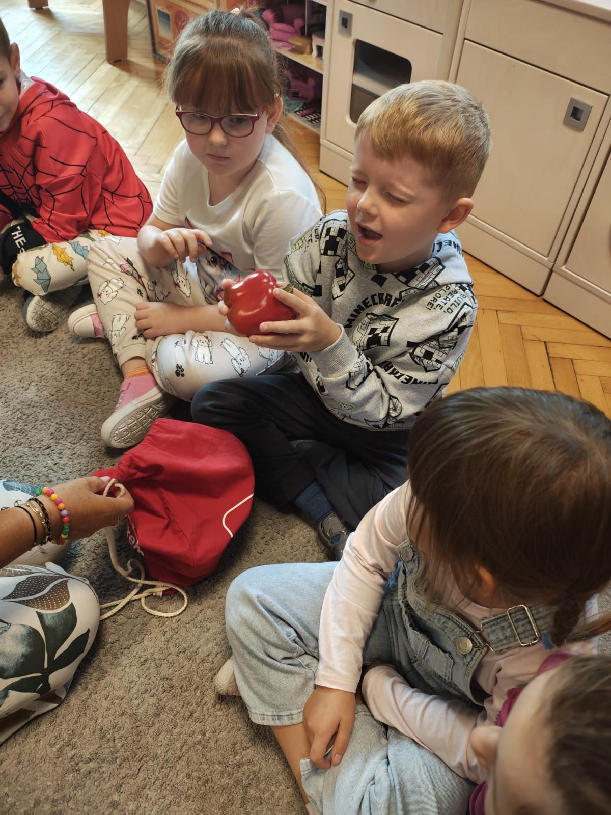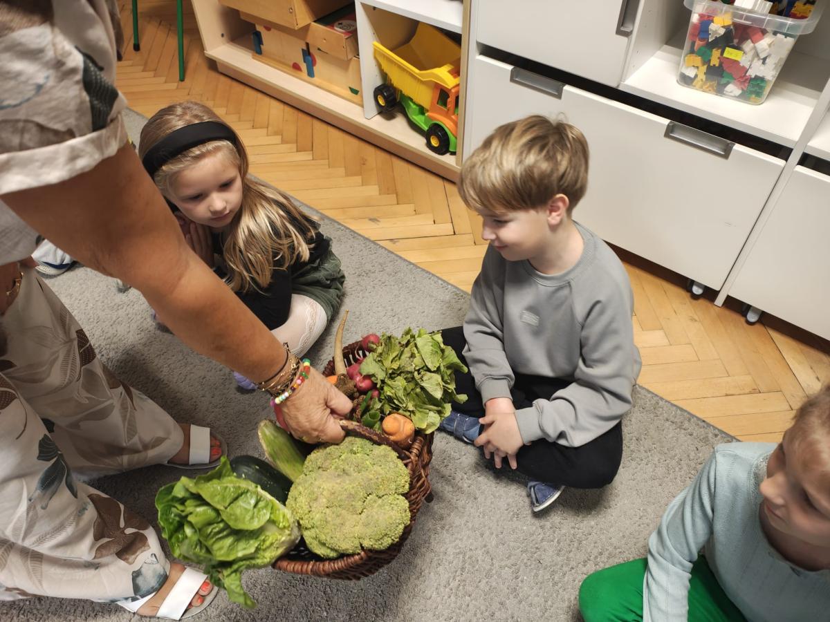 Dziaj na zajeciach utrwaliliśmy sobie nasze wiadomości o warzywach. Dzieci z zadowoleniem wyjmowały z worka warzywa i poznawały zmysłem dotyku nie patrząc jarzyny. Potem lepiliśmy dyńkę z plsteliny. Zobaczcie sami jak fajnie się bawiliśmy.....